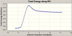 As can be seen from the graph a minimum has not yet been reached and that one of three things must be carried out to reach a minimum; run a normal optimisation on the last IRC point, restart the IRC with a larger number of points or redo the IRC specifying the force constants to be recalculated at each step. Each of these types of calculations was then carried out.