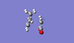 The transition state geometry of a Diels Alder cycloaddition reaction was now calculated and the nature of the reaction path examined. The optimised cis butadiene molecule from the earlier section was loaded and a ethylene group added to the molecule group, the ethylene was then orientated above the cis butadiene double bonds with a bond length of 2.1 Å set between the terminal carbons from the ethylene and the cis butadiene. This stucture was then cleaned in GaussView and the force constants method was used as it was seen earlier that it produces good results in a quick time. 2.1 Å was chosen as it is longer than a standard C-C bond but there is still significant interactions. A opt-freq calculation was then carried out using the TS (Berny) method with force contants calculated once, the additional keywords set as opt=noeigen and the semi-emperical AM1 method used. This gave the following data as seen below[26].