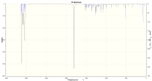 Initial geometry optimisation of the molecule gave an energy minima at 15.732 kcal/mol. Infra-red and 13C NMR data were predicted from computational methods, and the optical rotation of the molecule was also predicted. Figures 17 and 18 show these spectra respectively.