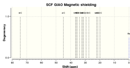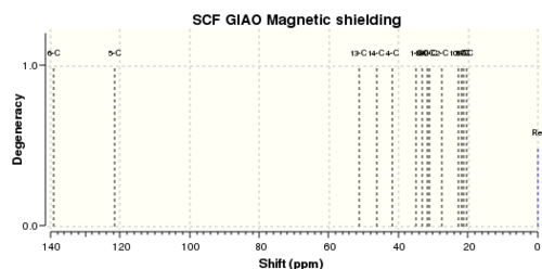 The majority of the peaks located within the spectrum can be assigned to functional groups within the molecule. The ranges of peak frequencies predicted are in good agreement for those obtained experimentally. Table 9 shows chemical shifts for the predicted C-13 NMR spectrum of menthone, along with assignments of carbons and reported literature results. The method is known to be accurate to around 5ppm, and so this has been taken into account when comparing results to the literature. C1 is regarded at the carbon at the carbonyl group. Ring carbons are then labelled ascending clockwise.