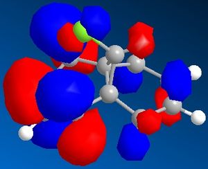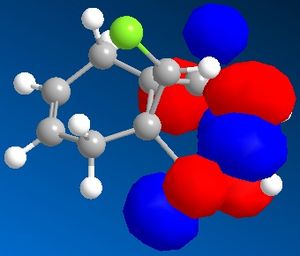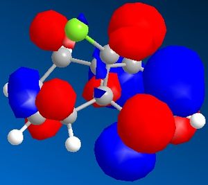 Initial analysis of the results suggests that the orbitals produced seem logical. It can be seen that the HOMO-1 and the HOMO are a pair of bonding pi-orbitals, the former with most interactions located on the double bond exo- to chlorine, and the latter with interactions focused on the endo-double bond. The LUMO and the LUMO+1 also form a second pair of orbitals; again, the former is located on the exo-double bond and the latter on the endo-. The final orbital, the LUMO+2, is an anti-bonding Cl-C sigma-orbital. Since the molecule is quite symmetrical (with the exception of the substituents on the cyclopropyl ring), these results seem to be in agreement with what would be expected.