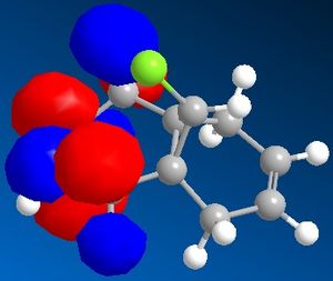Figure 7 shows a molecule of dichlorocarbene. Initially the optimum geometry was calculated using the MM2 force field, before the MPOAC/PM6 method was employed to determine the molecular orbitals of the molecule. From study of the molecular orbitals, the reactivity of the double bonds can be rationalised; namely, if they can be distinguished from an MO perspective and if so which is the more likely to react. Molecular orbitals obtained from this procedure are shown in figures 8 to 12.