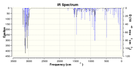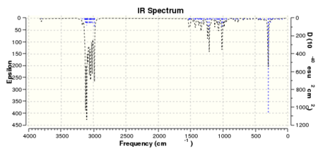 Table 8 shows frequencies of predicted peaks within the IR spectrum, and their relevant assignments. It is noted that predicted peaks are often systematically higher (by up to around 8%) than the true values. Corrected values for peaks (taking into account the maximum error) have thus been included.