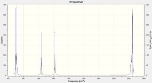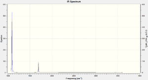 Using the 3N-6 vibrational modes rule, where N = 4, 6 vibrational modes are expected. Modes 2 and 3 are degenerate as well as 5 and 6. Modes 1, 2 and 3 are bending modes and 4,5 and 6 are streching modes. Mode 4 is a highly symmetric bending mode. Mode 1 is known as the "umbrella" mode. 4 bands would be expected to be seen in an experimental spectrum of ammonia gas due to 2 sets of 2 degenerate vibrational modes. The predicted IR spectrum from Gaussview is shown below.