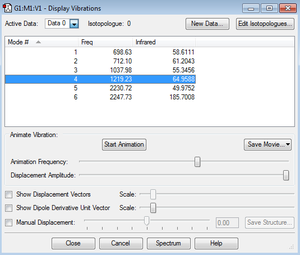 Based on the predicted absorption frequencies by Gaussview, 6 peaks should appear in the IR spectrum of H2SiO, at frequencies of 699, 712, 1038, 1219, 2230 and 2247 cm-1. This is in agreement with the 3N-6 rule for the number of vibrational modes. Furthermore, all vibrations produce a relatively large change in dipole thus, have relatively high absorbance.