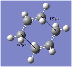 The result indicated that the transition state structure has a separation of 2.27 Å between the terminal carbons, which correlates perfectly with the literature value.[1] However, typically, sp3 and sp2 C-C bonds have lengths of 1.54 Å and 1.34 Å respectively.[2] Therefore, the 'partially' formed C-C bonds in the transition structure cannot be formally classed as proper bonds. Nevertheless, the normal covalent radius of carbon atoms is 1.70 Å. [3] As the separation between the terminal carbons of the reactants is significantly shorter than the twice the length of the covalent radii (3.40 Å), there is a strong sign of interaction between the components. It is also interesting to observe that the C-C bond that would become the C=C carbon double bond in the cyclohexene product has a bond length of 1.47 Å, which is between the length for a formal C-C single bond and that of a C=C double bond.