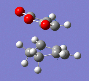 The second system studied involves the Diels Alder cycloaddition between the electron deficient dienophile, maleic anhydride and the electron rich diene, cyclohexa-1,3-diene. The reactants were first optimised, thereafter, the transition states were located in order to compare the relative energies and investigate the reaction paths. In this reaction, two possible combinations of the reactants exist, depending on the orientation of them during the formation of the transition state. The combination with the oxygens of the maleic anhydride directly above or below the diene fragment of the cyclohexadiene is known as the endo form, whereas the orientation with the oxygen atoms pointing in opposite directions to the diene is known as the exo form.