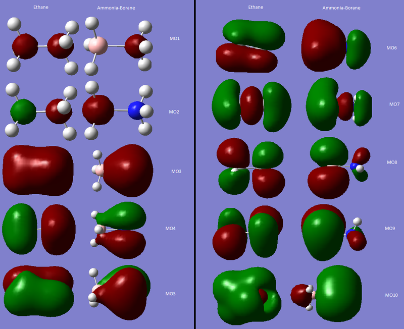 Shown are the Molecular Orbitals for both Ethane and Ammonia-Borane. In Ethane, the molecular orbitals are symmetric through the C-C bond as the molecule has a mirror plane through this bond. In Ammonia-Borane this symmetry is broken by having two different atoms (N-C). The difference in electronegativities of these atoms means the atomic orbitals associated with the NH3 and BH3 fragments will be at different energies, resulting in non-symmetric molecular orbitals. Nitrogen is more electronegative than Boron, therefore the atomic orbitals of the ammonia fragment will be lower in energy (more negative). This will mean that the bonding atomic orbitals will have a greater contribution from the ammonia fragment, whereas antibonding orbitals will have a greater contribution from the borane fragment. This can be seen clearly in MO3, which is totally bonding- in ammonia-borane there is far more electron density on the ammonia fragment. In contrast, in MO8, an antobonding MO, there is far more electron density on the borane fragment.