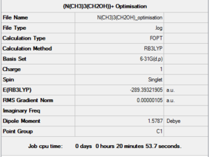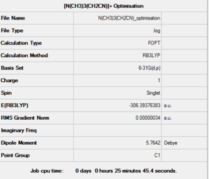 The cation was firstly drawn on GaussView and then set up to be optimised. The parameters used were the usual ones: B3LYP method, 6-31G(d,p) basis set and opt=tight, scf=conver=9 and int=ultrafine as additional keywords. The calculation was run on the HPC SCAN portal (DOI:10042/27762 ), a summary is shown in Figure 34 and the logbook entry showing convergence follows.