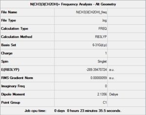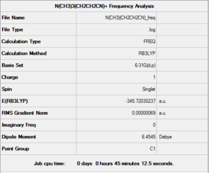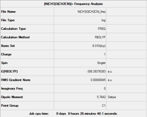 The optimised structure of the cation was used to compute a Frequency analysis. The same parameters were used, and the calculation was sent to the HPC SCAN centre to be run (DOI:10042/27783 ). A summary is shown in Figure 40 and the logbook entry showing near convergence follows.