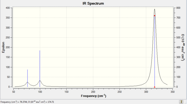 It is worthy of note that although the Gaussian output file showed 6 vibrations, we can only observe 3 vibrations in the predicted spectrum. This is firstly because the totally symmetric A1' vibration is totally symmetric and therefore implies no change in dipole. This makes this vibration IR-inactive and explain why it has zero intensity and it is not seen in the spectrum. Additionally, the four E1 vibrations are doubly degenerate and therefore will show as one peak instead of two.