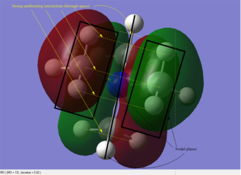 The LUMO of the longer CN-containing cation is also stabilised by the strong AO interactions around the central atom. When compared to its shorter counterpart these interactions actually seem stronger, due to the possibility to overlap with the orbital lobe in the same phase on the extra -CH2- group. This factor, which might lead to predicting a higher stability, is contrasted by the higher number of very strong through-space antibonding interactions, which also explain why this MO is antibonding overall.