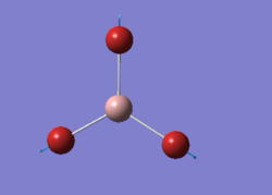 This calculation was setup by changing the H atoms in the 6-31G(d,p) optimised BH3 file into Br atoms and then performing a hybrid pseudo-potentials/basis set optimisation on this molecule within the HPC SCAN portal. The method used this time was GEN, which allows to set specific basis sets for each atom, with the additional pseudo=read gfinput keywords, allowing to also set a specific basis set for each atom and to specify which one by editing the input file with Notepad or similar text editor (unfortunately the editing cannot be done within Gaussview). It was chosen to use a combination of the 6-31G(d,p) basis set and the LanL2DZ pseudo potential.