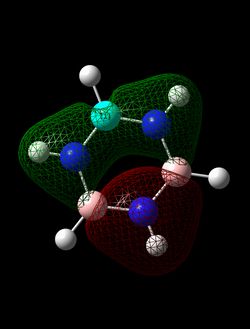 The p-orbital overlap picture of aromaticity is, however, insufficient as the σ framework is of key importance to the more detailed picture of aromaticity [1]. Literature suggests that in benzene, π electrons prefer to localise, whilst σ electrons prefer to delocalise. Hence the idea of equivalent intermediate bonding is in fact not an effect of p-orbital electron delocalisation but of the σ framework. This notion is in qualitative agreement with the MOs calculated, and can be employed to understand the relative aromatic resonance energy of benzene and borazine. If we assume that the relative number of delocalized sigma MOs for each molecule gives an indication of the relative contribution of the sigma framework, we can see that in benzene 2 MOs (7 and 12) contribute to a delocalised sigma framework, whereas in borazine, only MO 7 contributes to this framework. This reduced component of sigma framework explains the reduced resonance energy of borazine compared to benzene.