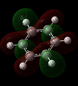 The MO analysis of benzene gave three bonding and three antibonding π MOs, intermixed with various σ MOs. Each π MO shows a nodal plane in the plane of the ring and lobes extending accross multiple carbon atoms. This gives the notion of charge being delocalised over multiple carbon atoms, leading to a basic picture of aromaticity. MO 17 in particular shows one large lobe above and one below the plane of the ring. This explains the commonly cited criteria for aromaticity such as intermediate bond lengths and increased energetic stability compared to the alkene equivalent. However, MOs 20 and 21 also show more complicated phase patterns of p-orbital overlap, both of which contribute to the delocalised electron cloud above and below the ring.