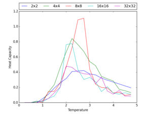 Increasing the temperature above the Curie temperature induces a phase transition. This means that the magnetisation of the system will rapidly drop and from this the heat capacity of the system can be found using the relationship . It is known that the heat capacity should become very strongly peaked at the phase transition temperature and the code used to plot a graph showing the heat capacity versus temperature for each of lattice size is: