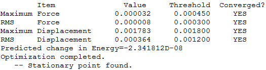 The two graphs calculated by Gaussview show information about the energy of optimisation. The first shows the total energy curve, showing the changes in energy over the optimisation steps, following the curve down until it is at the optimised geometries with the minimum energy. This is the stable state equilibrium position. The graph moves along the potential energy surface for the molecule until reaching the lowest energy geometry.