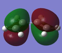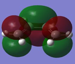 The MOs were then computed and images of the HOMO and the LUMO can be found below. It can be seen that the HOMO is anti-symmetric with respect to eh plane, whereas the LUMO is symmetric.