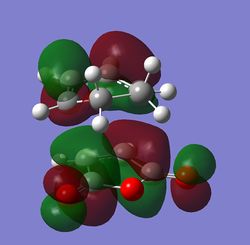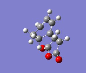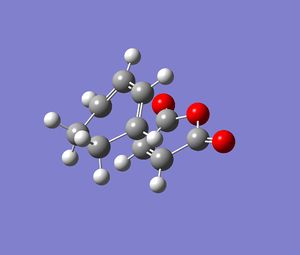 The next step was to investigate the regioselectivity of the Diels-Alder reaction. The reaction studied was that of the addition of cyclohexa-1,3-diene to maleic anhydride. The first step was to individually optimise the molecules at the HF/3-21G level. The log file for the cyclohexa-1,3-diene and maleic anhydride optimisations can be found here and here respectively.