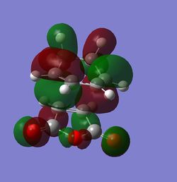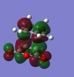 As can be seen from the jmol, the molecule is not planar and has a dihedral angle of around 30°. This is consist with the literature,which says that the most energetically stable molecule is between the gauche and the planar form, due to steric hindrance between the protruding hydrogens[2]. It is assumed that the best conformation for optimum orbital overlap is the s-cis conformer. As this excercise relies heavily on the overlap of the different MO's, the molecule will be reoptimised with a fixed dihedral angle of 0°, in order to get best overlap with the dienephile.