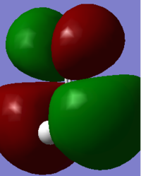 The MO found at the next level has an energy of -0.26816 a.u. and is shown above. This MO is the highest occupied molecular orbital (HOMO) of formaldehyde, containing two electrons. The AO's that make up this are the p orbitals of C and O. They have a different orientation to the AO's in the previous bonding MO. They also have opposite phases so form an antibonding orbital - this will decrease the bond strength.