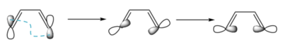 Woodward and Hoffmann suggested that the stereochemistry of electrocyclic ring opening reactions is controlled by the symmetry properties of the HOMO of the open-chain conjugated system [18], i.e the substituted acyclic butadiene (in this reaction), as well as by FMO theory. Electrocyclic reactions cause a stereochemical alteration at the reacting termini atoms via a rotational process [19]. These reactions are classified according to this rotational process; if the terminal atoms (or groups) rotate in the same direction it is known as conrotation whereas if they rotate in opposite directions it is called disrotation.
