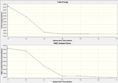 The results above show that the optimisation has converged, as the energy and the gradient have both decreased, showing that Gaussian has run the optimisation correctly. As can be seen from the results of the optimisation, the inital guess for the geometry of the molecule is quite good, as it only took less that 10 iterations of the algorithm before a local minimum was found. In the results graph the total energy of the graph is going down until it converges at a minimum, indicating a local minimum has been found. The bond length found in this calculation is 1.19 Å and the bond angle 120.0°.