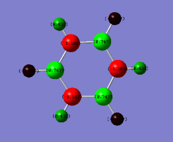 Ng611 (talk) 18:54, 21 May 2018 (BST) Good discussion of the effects of electronegativity on the overall charge distribution. What do the partial charges sum to, and is there any difference in partial charge for atoms related by symmetry?