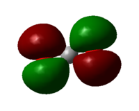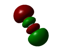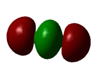 LUMO of CO2, generated by the out of phase overlap of the 2p AOs on all the atoms. Each lobe repel each other which explains how the outer lobes are squeezed outwards.