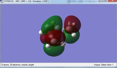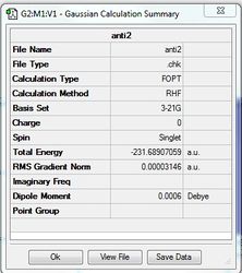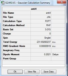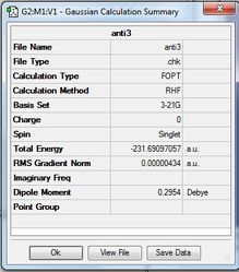 The 'anti2' structure was then reoptimized at a higher level of theory to calculate a more accurate value for its energy. The basis set selected determines the overall accuracy of the optimization. It can be observed from the findings below that the B3LYP/6-31G(d) method gives a slightly lower value for the conformer's energy (-234.611 Hartrees (B3LYP/6-31G(d) vs. -231.693 Hartrees (HF/3-21G)).