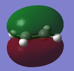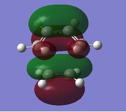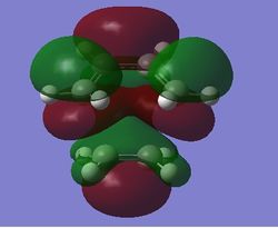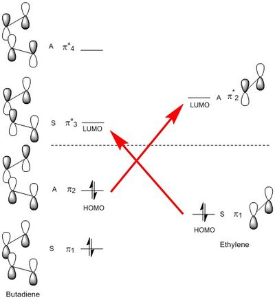 The modeling of the molecular orbitals has confirmed the theory that the electrons from the HOMO of butadiene (a) will go into the LUMO (a) of ethylene. This reaction is allowed due to Woodward and Hoffmann rules which state that there must a conservation of orbital symmetry[10] which allows for a constructive overlap of the two interacting orbitals.