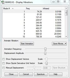 Upon running the first frequency calculation at the same level of theory (B3LYP/6-31G), the IR vibrations were found and none were imaginary, implying that there is no negative force constant. No imaginary frequencies correlates to the fact that this optimized structure is not a transition structure and is in fact a minimum on the potential energy surface.
