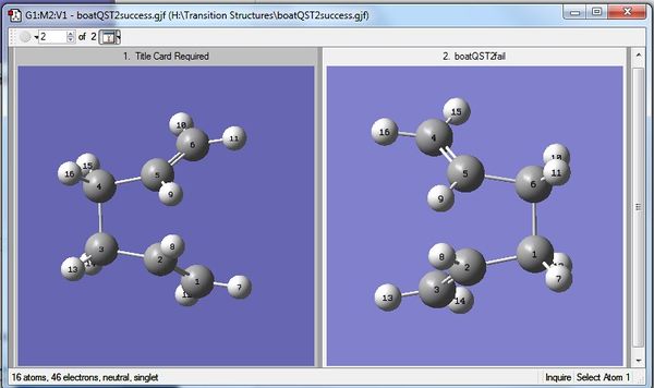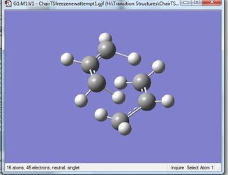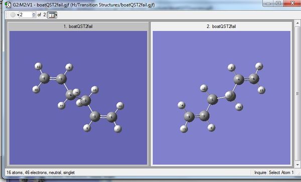 When the chk file was opened the structure shown is similar to the chair transition structure but the two allyl fragments are a bit further apart. It is evident that the QST2 function cannot locate the boat transition structure from these reactants and products.