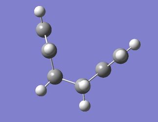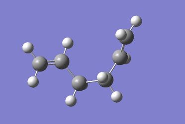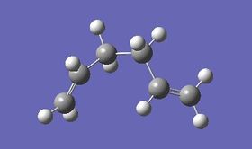 Based on the results that have been gathered from optimisations of various conformations of 1,5 hexadiene, it is possible to predict the lowest energy conformation. Since antiperiplanar conformers are on average comparable in energy to the gauche conformations, it is difficult to predict without running optimizations, whether one conformer is exclusively lower in energy than the other. From tables 1.1 and 1.2 it is evident that the global minimum is the 'Gauche3' structure with an energy of -231.6927 Hartrees. This can be rationalized by considering orbital overlaps in this gauche form. There is a favorable overlap between π orbital and the vinyl protons[1]. Anti 3,4 and Gauche 1, the CC-eclipsed forms have higher relative energies than CH-eclipsed forms (Anti 1,2 and Gauche 2,3,4 of which Gauche 4 is the highest energy conformer due to the relatively close approach of the 2 hydrogens (2.5Å[2])