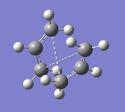 Below is an animation of the vibration that occurs at the Transition state. From the computational analysis done the formation of the two bonds appears to be synchronous. However, there has been much debate about the exact mechanism of the diels alder reaction. Therefore, it cannot be definitively concluded that the mechanism is indeed synchronous. Woodward and Katz[11] postulated that the cope rearrangement was of great relevance to the mechanism of the diels alder as both reactions have similar transition states. In their journal article they mentioned that they found that one bond formed first before the other began to barely form - alluding to an asynchronous mechanism. Yet, on the other hand Dewar[12] reported the presence of a "symmetric cyclic transition state". He additionally completed AM1 computational calculations which revealed that the transition state is indeed synchronous for the butadiene-ethylene diels alder reaction. This finding was further confirmed by additional studies [13][14]