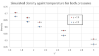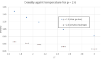 For the ideal gas law, the values for the density were obtained as follows: Figures 12 and 13 show that in both cases (p = 2.2 and p = 2.6), the simulated density is lower than that obtained from the ideal gas law. This is because the ideal gas law assumes that the potential energy in the system is only due to thermal energy; i.e. it ignores interatomic interactions. In reality, these do have an effect on the density, as shown by the outcome of the simulations. The density will be lower in a real situation compared to an ideal gas because of the repulsive interaction between atoms, which prevents having the same number of atoms as an ideal gas in a specific volume. However, as we go to higher temperatures, the simulated value and the value from the ideal gas law are closer (smaller discrepancy). That's because when T is very high, the thermal energy factor, which confers to the atoms their kinetic energy, overrides the interatomic repulsion: when kinetic energy is very high, atoms move around very quickly so if we're focusing on a specific volume, we'll find that the number of atoms in that volume decreases with increasing temperature. Hence the simulated density value and the density value from the ideal gas law are more similar. As for the general trend observed in figures 12 - 14, as expected, density decreases with increasing temperature because increasing temperature implies higher kinetic energy associated with each atom, so they repel each other more strongly, thus reducing the number of atoms present in a given volume.