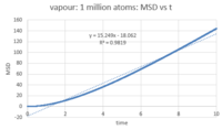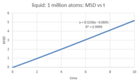 - TASK: make a plot for each of your simulations (solid, liquid, and gas), showing the mean squared displacement (the "total" MSD) as a function of timestep. Are these as you would expect? Estimate D in each case. Be careful with the units! Repeat this procedure for the MSD data that you were given from the one million atom simulations.