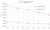 - TASK: As in the last section, you need to run simulations at ten phase points. In this section, we will be in density-temperature phase space, rather than pressure-temperature phase space. The two densities required at 0.2 and 0.8, and the temperature range is 2.0, 2.2, 2.4, 2.6, 2.8. Plot C(v)/V as a function of temperature, where V is the volume of the simulation cell, for both of your densities (on the same graph). Is the trend the one you would expect? Attach an example of one of your input scripts to your report.