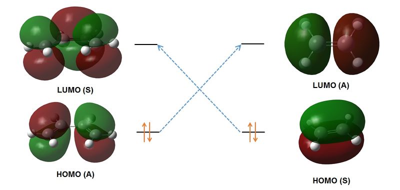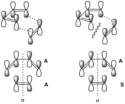 This affinity for 4n+2 electrons can be rationalized through consideration of the frontier orbitals involved in the reaction. In order for the concerted formation and breakage of bonds to occur, each interacting orbital must be of the correct parity to constructively interfere and thus form a bond. This can be further developed through consideration of the change of orbital parity over a mirror plane passing through the center of the molecule. A symmetric orbital system will not result in any parity change across the mirror plane, while an antisymmetric system will exhibit a parity change. Symmetric-Symmetric and Antisymmetric-Antisymmetric orbital interactions will always give rise to constructive interactions and thus allow the concerted formation of bonds. Symmetric-Antisymmetric interactions, however, will always possess one anti-bonding interaction and thus cannot result in concerted bond formation (stepwise bond formation, however, is still possible in certain cases).[14]