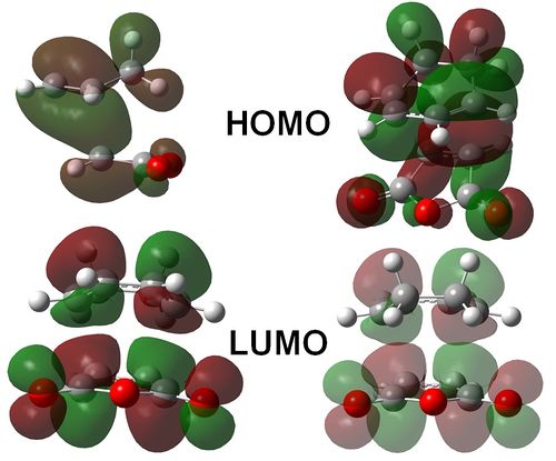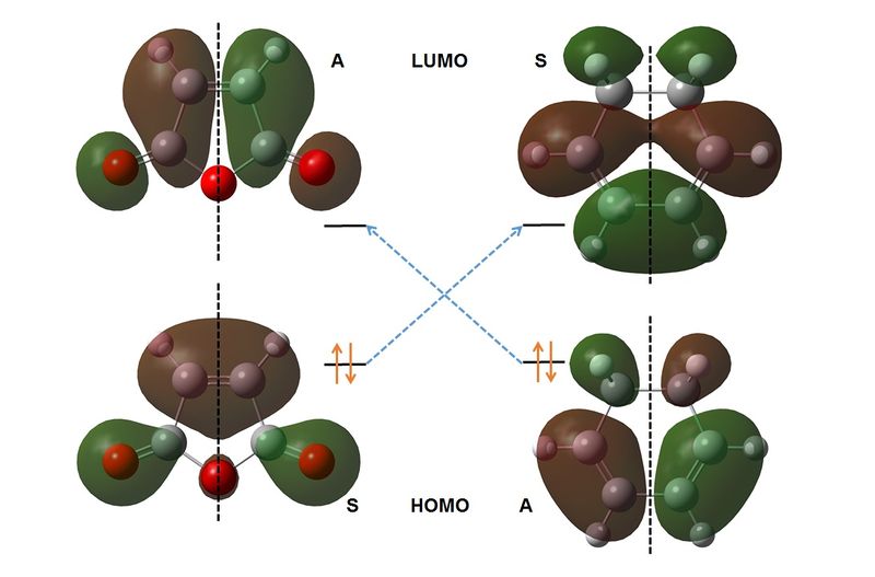 The maleic anhydride and cyclohexadiene were generated separately and optimized at the B3LYP/6-31G** level of theory. The resulting HOMO and LUMO of both molecules was computed and saved as an image file. The symmetry of these orbitals was determined and plotted on an orbital correlation diagram.