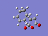 Figures 3.9 and 3.10 show visualizations of the Diels-Alder cycloaddition for the endo and exo forms of the adduct. The resulting secondary orbital interactions can be seen in figure 3.11. The inward facing anhydride group is able to interact with additional MO's on the cyclobenzadiene, thus generating a stabilizing effect. This lowers the energy of the corresponding transition state, thus accounting for the discrepancy in energy of the two forms.