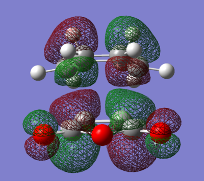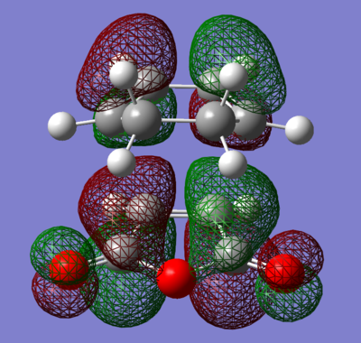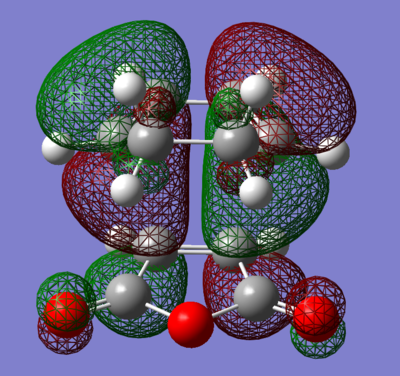 AM1 is a semi-empirical method for the calculation of molecular electronic structure in quantum mechanics aspect. It mainly based on Neglect of Differential Diatomic Overlap integral approximation (NDDO), in which the repulsion of atoms at close separation distances was reduced. [9]. From the first part of this investigation, B3LYP/6-31G* theory was found to have good performance for molecular thermodynamic. This is because the effects of polarization are taken into account in this theory[10]. Therefore, it was used in the further calculations of TS for giving more reliable results (see above). The downside for B3LYP/6-31G* theory is the checkpoint files of the TS for both cycloaddition cannot open successfully due to bad data, so no MOs can be plotted. Thereby, the HOMOs and LUMOs shown in above were obtained from AM1 calculation