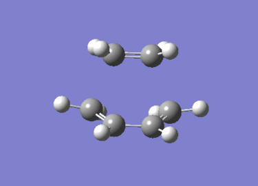 For Semi-empirical/AM1 , the vibrational mode corresponds to the reaction path at the transition state was shown in the Figure 8. The terminal ends of ethene and cis-butadiene were approached to each other in a concerted manner during the vibration, this implied that the two new sigma C-C bonds was formed synchronously. Unlike the stretching modes in the TS vibrational frequency, both molecules were undergoes bending motions at the lowest real vibrational frequency ( 147.09 cm-1, Figure 9). More structural changes involve in the vibration of the TS, so a higher energy will be needed in causing vibration, hence a larger in magnitude of vibrational frequency was observed for TS.