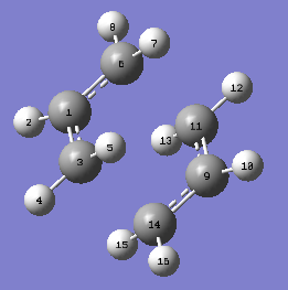 This method involves using input structures for the reactants and products for a particular reaction and the calculation will try to find a structure inbetween them that corresponds to the transition state. The prerequisite for this method is that the atom numbering is the same in the reactants and the products. In the case of 1,5-hexadiene the product and the reactant are the same, however still, as shown in figure 4, the atom numbering must be manually changed for the calculation to proceed correctly. Molecule 1 and 2 represent the reactant and product respectively. The renumbering below was carried out by editing the atom list using Gaussview.