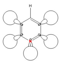 The situation in pyridinium is effectively the opposite of the charge distribution in boratabenzene compared to benzene. As one carbon atom has been replaced by a nitrogen and a positive charge added the sum of all the individual charges will add up to an overall charge of 1. Nitrogen is in group 5 of the periodic table and is therefore more electronegative than carbon. As a result it has a charge of -0.476 and pulls electron density away from other atoms making them more positive. The hydrogen attached to the nitrogen has an increased positive charge of 0.483, while the rest of the hydrogens have a charge in the range 0.285-0.297 similar again to the other values on different molecules. Again the same ortho para directing effect of charge distribution is present again with the adjacent carbons having a positive charge of 0.071. At the para position the carbon has a more negative charge of -0.122 and the most negative carbons being at the meta position with a charge of -0.241. This is due to the electronegativity effects over the electron cloud above and below the ring.