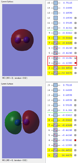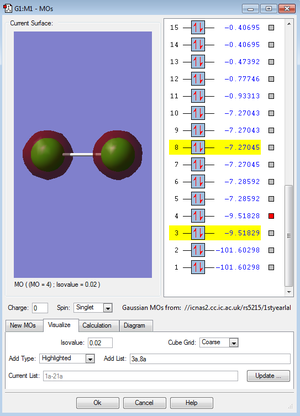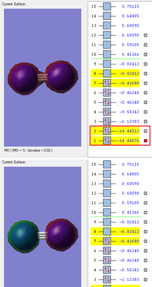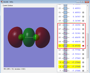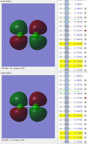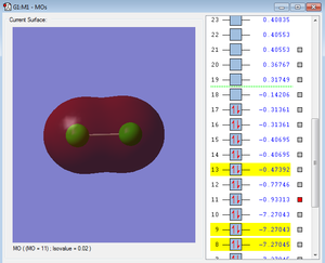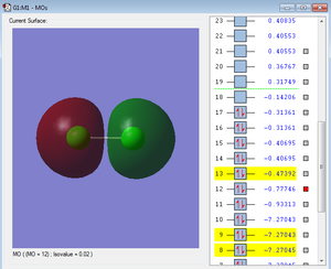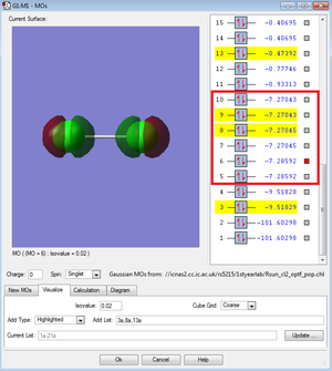 These MOs are also deeper in energy than the MOs produced by the valence electrons - these are in the range of -7.2 to -7.3. Similarly to the 1s and 2s orbitals, there is no overlap. Because of this, the difference in energy between the bonding and antibonding MOs is very slight. These orbitals are not very involved in chemical bonding.