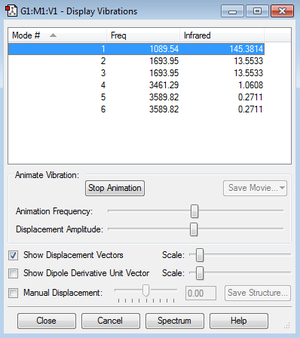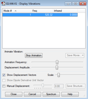 The screenshot shows that there is only one mode of vibration, as expected from the 3N-5 rule for linear molecules. The vibration is a 'bond stretch' vibration.