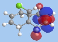 On the whole, the orbitals from MOPAC/RMI are fairly symmetrical with respect to the plane of symmetry in this Cs molecule. The molecular orbitals obtained are in line with chemistry intution. A π-orbital is expected to be the HOMO orbitals. However the position of the Cl atom is affecting the energy of the endo π-orbital. The difference in energy of the two double bonds is due interaction of the exo π-orbital with Cl-C σ* orbital. Energy of the exo π-orbital is therefore lowered as shown in the molecular diagram in fig. 7. Reason for regioselective addition to the endo π-bond can now to explained. The endo π-bond is the more nucleophilic than the exo since it is at a higher energy. Therefore, electrophilc addition reaction wil occur at the endo π-bond first.