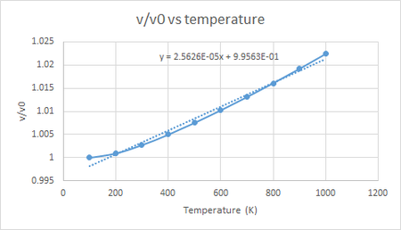 Where T is instantaneous temperature, m is the mass of the molecule, v is the velocity of the molecule and Nf is the number of degrees of freedom. In the molecular dynamics simulation, the volume of the MgO super cell at a particular temperature is determined by the average volume of all the frames of the simulation. The volumes of each frame of the simulation will be affected by the speed at which the ions in the MgO super cell are moving, which is determined by the temperature of the system. Hence for molecular dynamics simulations temperature of the system is the main factor in determining the volume.[6]