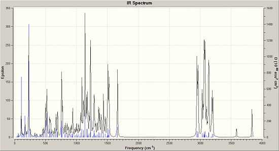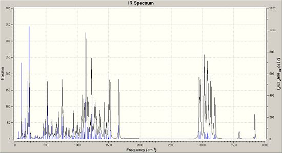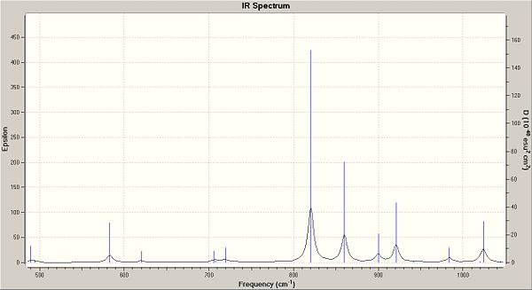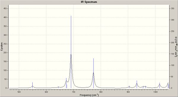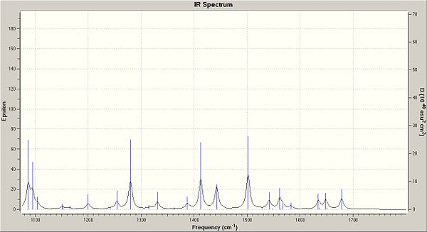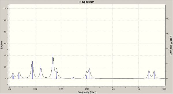 Above is a tabulated set of results of what were the given main IR peaks (un-assigned) in the data and a comparison of what the IR spectrum calculated quantum mechanically were. Interestingly enough, the main peak you would expect to see in theri table would be at 1747cm-1 as this is the main stretching frequency of the C=C bond.